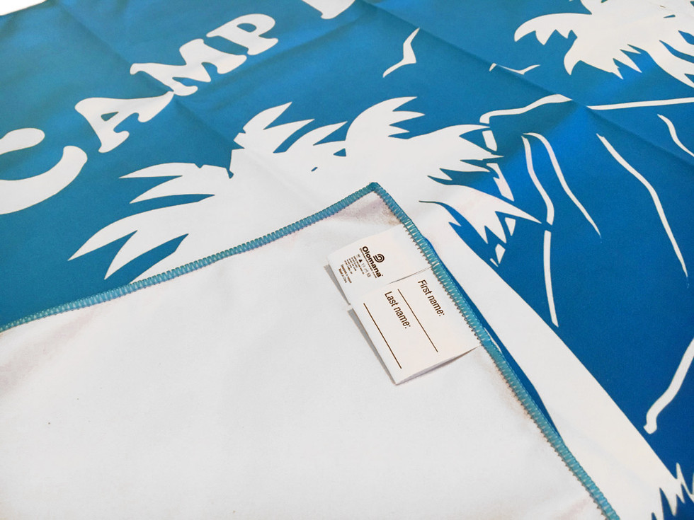 Microfiber Suede Towels for YMCA Camp Erdman. Quick-Dry, lightweight towels made in custom sizes with full-color graphics and matching flat-lock borders. Designed in Hawaii. For Hawaii.