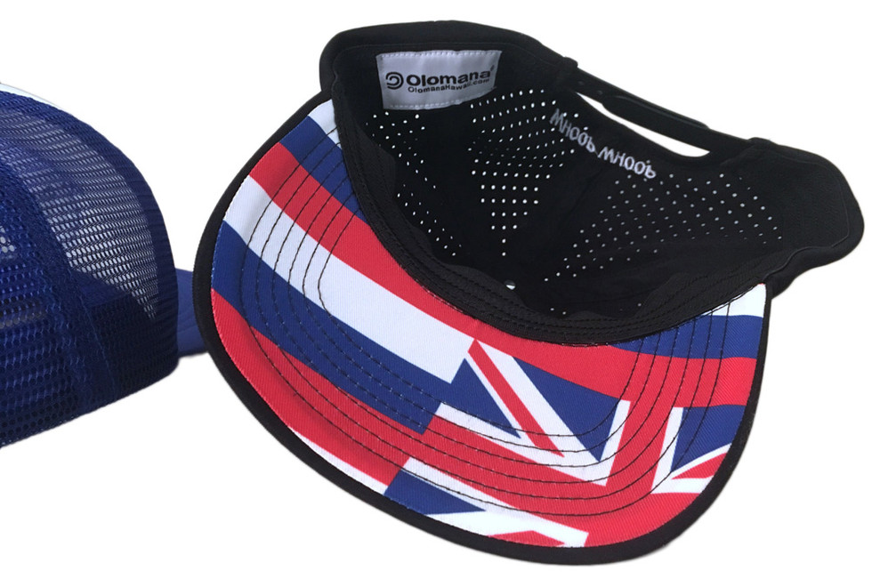 Custom Hats for VW Club of Hawaii. Hybrid hats and flat bill trucker hats with Hawaiian flag under brim. Front and back embroidered graphics. Plastic snapback, one size fits all. Hybrid hat made with elastic headband and stretchy fabric for added comfort. Designed in Hawaii. For Hawaii.